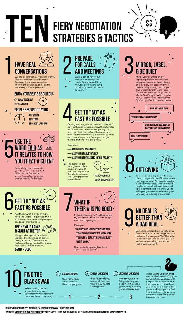 Berdasarkan infografik menarik karya Heidi Corley (berdasarkan buku legendaris Never Split the Difference oleh Chris Voss), saya merangkum 10 strategi negosiasi yang praktis namun powerful — cocok untuk pelaku usaha, konsultan, hingga para profesional yang ingin meningkatkan pengaruh dalam setiap percakapan penting.